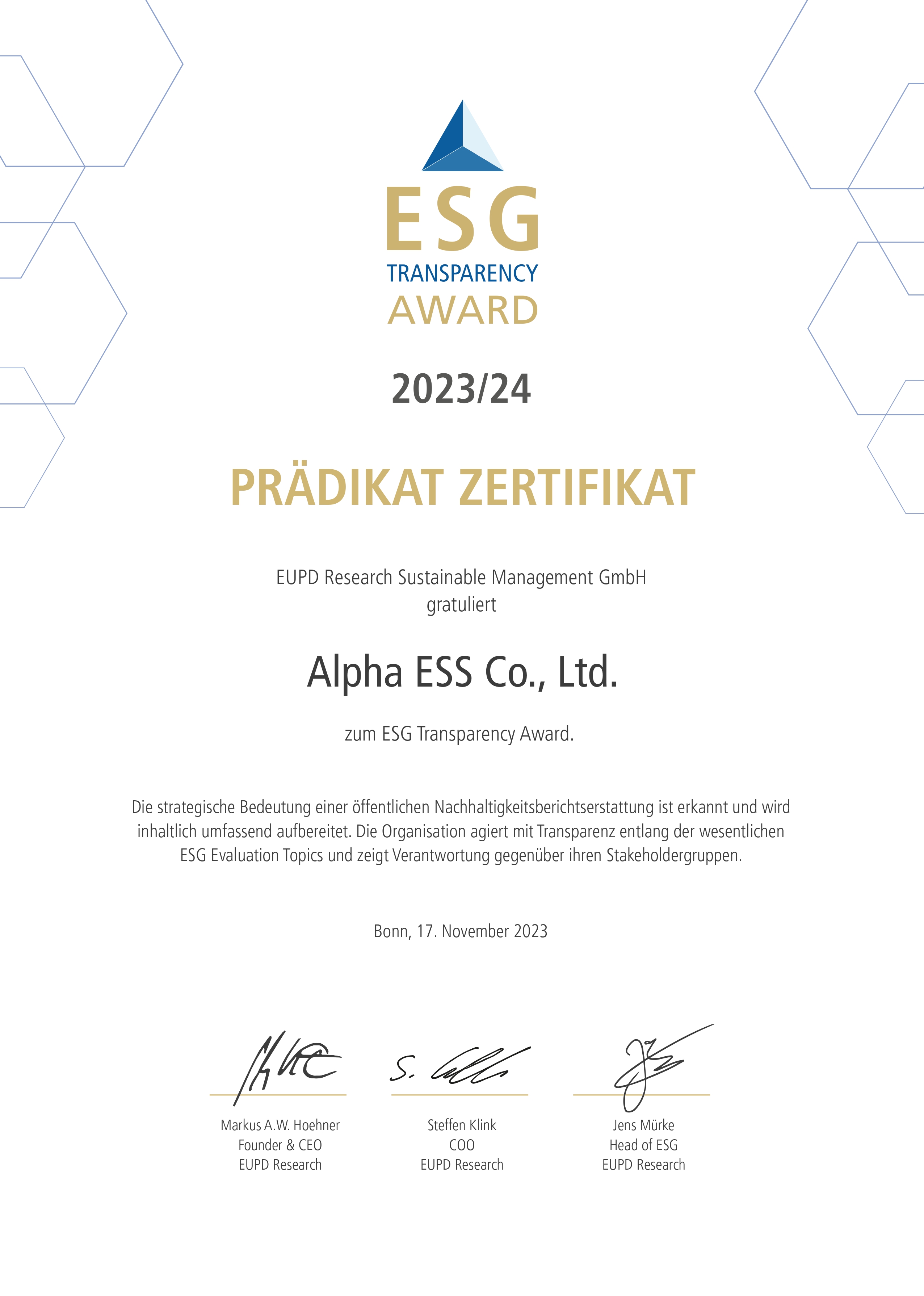 Energy Storage Solution & Serivce Provider AlphaESS Receives the ESG TRANSPARENCY AWARD for Its Sustainability Reporting2023-12-07